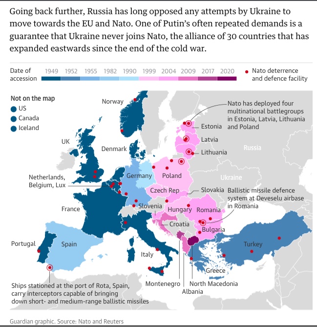 From The Guaradian, the map below shows the effect of Ukraine joining NATO, where the former Warsaw Pact/ USSR client states can be seen as falling dominoes, threatening Putin’s sense of geopolitical security.
